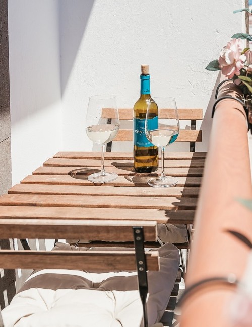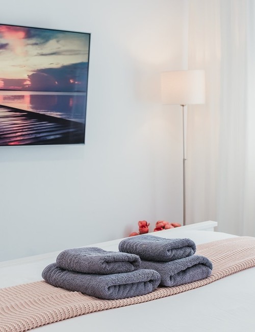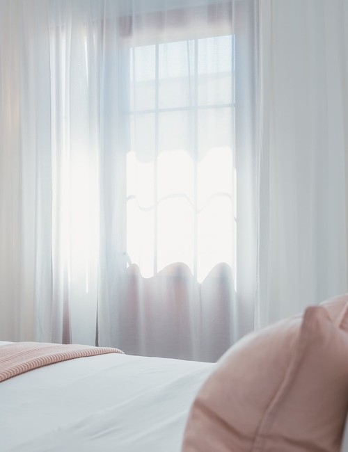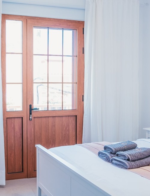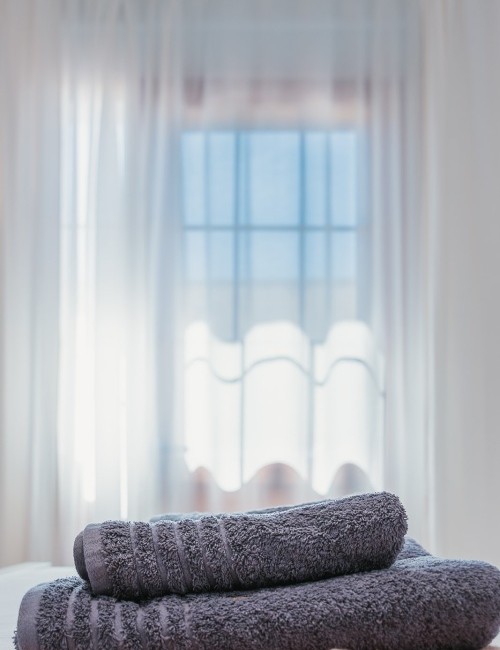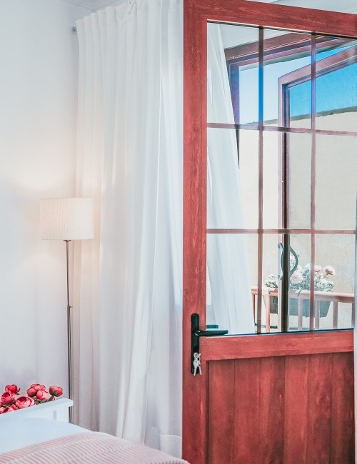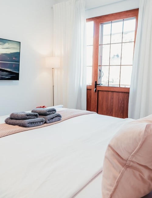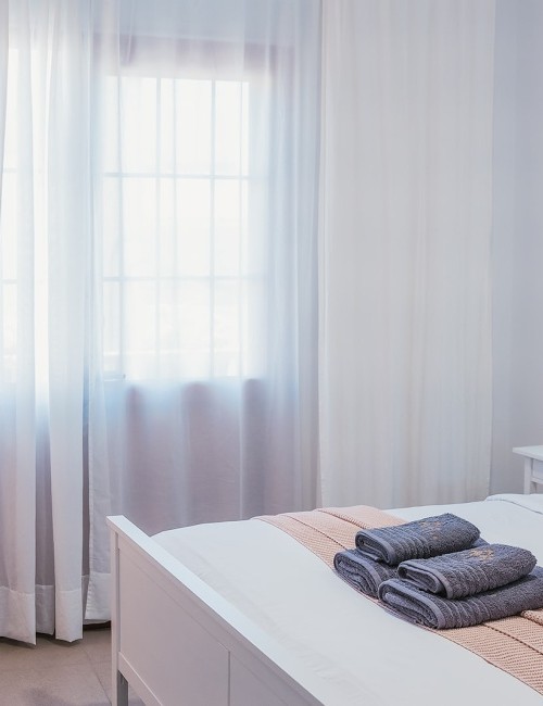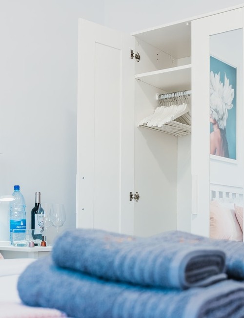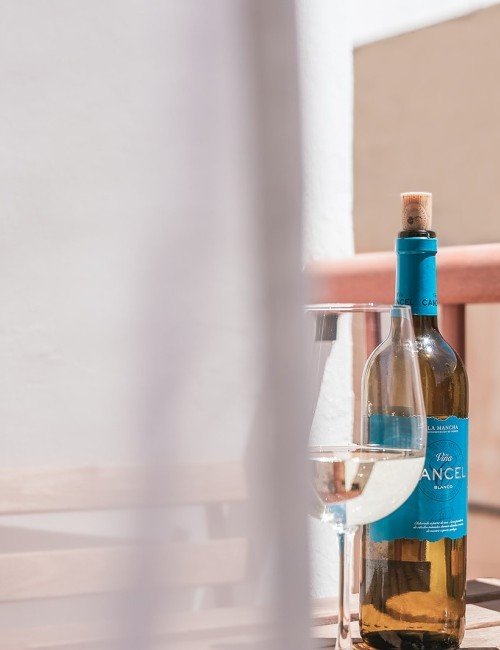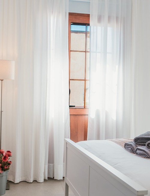 Amplia habitación de 15 m² con cama de 180 x 200 cm y acceso a balcón privado con vistas a una calle tranquila, al mar lateral, a la montaña y al casco antiguo. Dispone de puerta mosquitera, estor opaco, cortinas y visillos. Equipada con Smart TV de 55”, caja fuerte, armario con espejo y percheros, ventilador con mando a distancia y luces de ambiente regulables en color. Suelo de baldosas y puerta balconera con doble acristalamiento para mayor confort acústico y térmico. Cerradura electrónica inteligente.