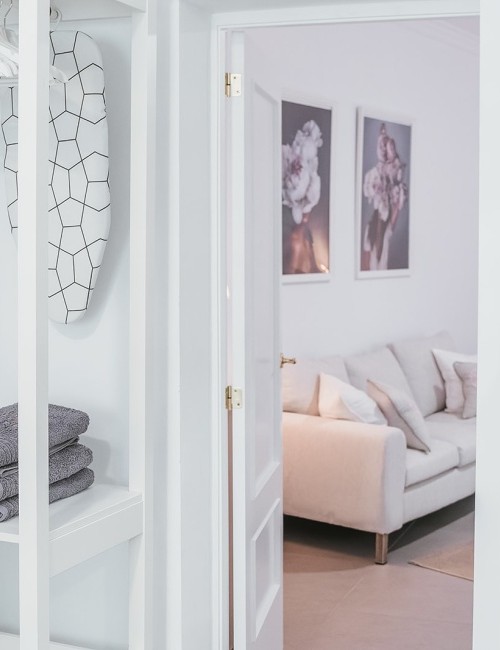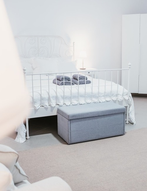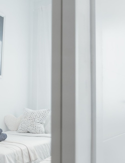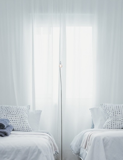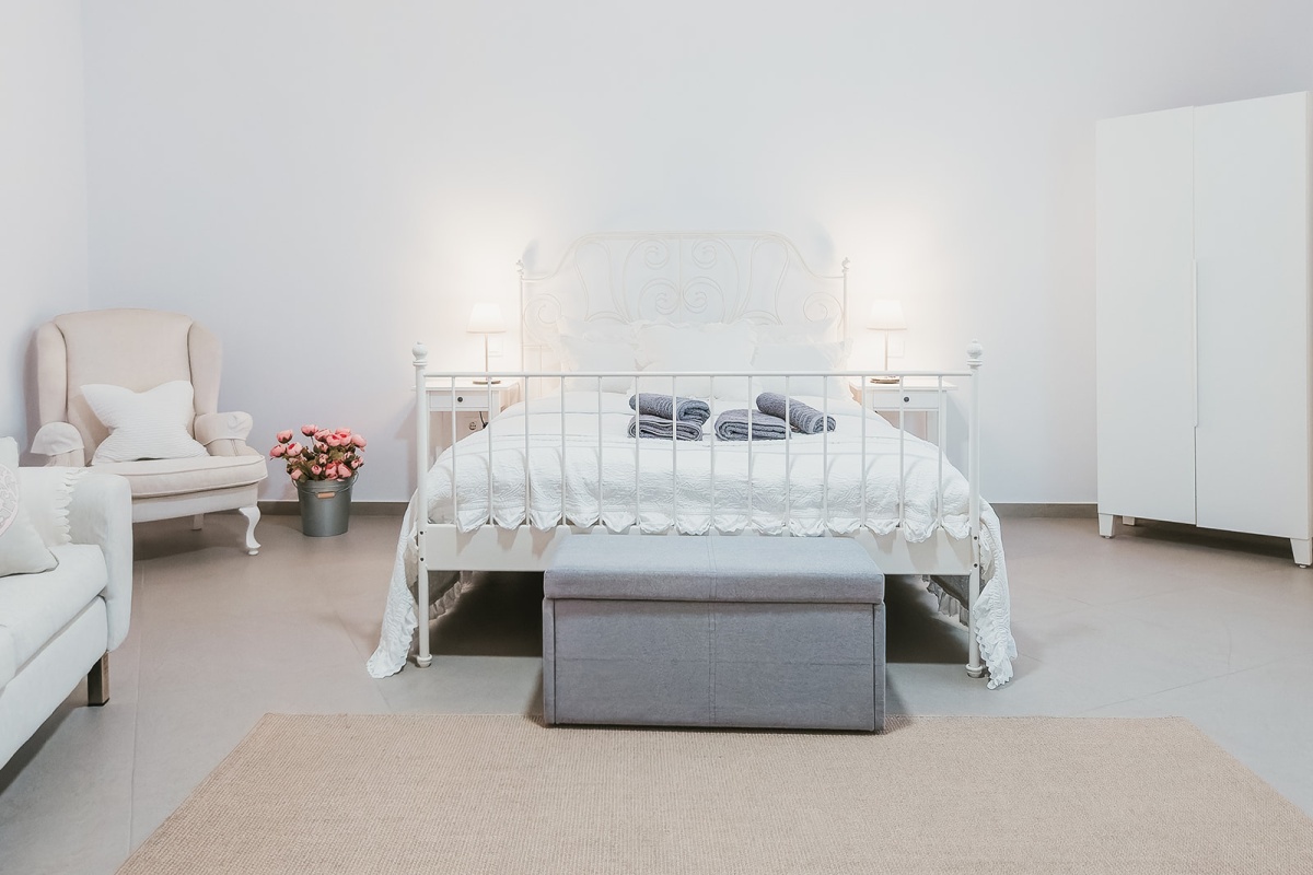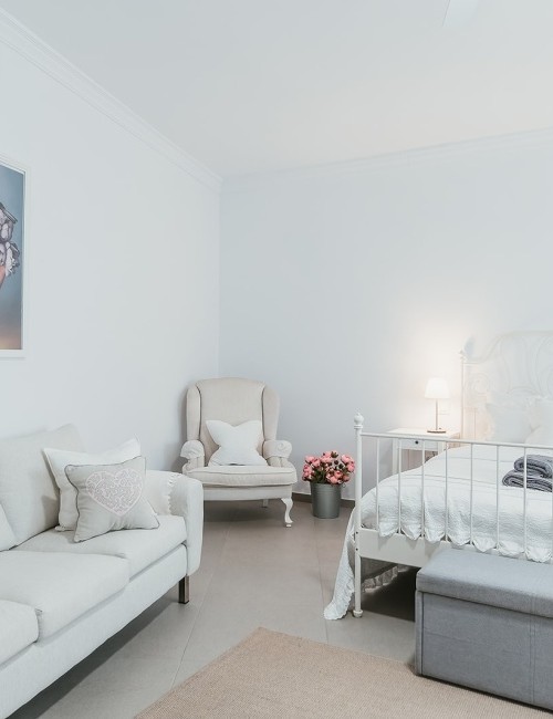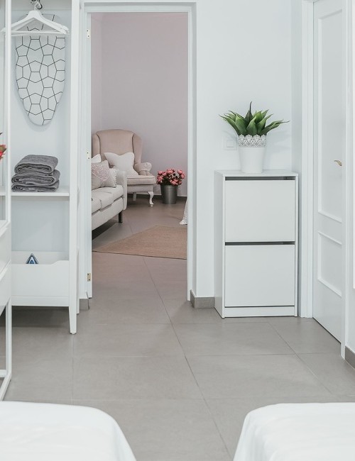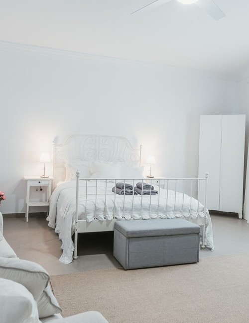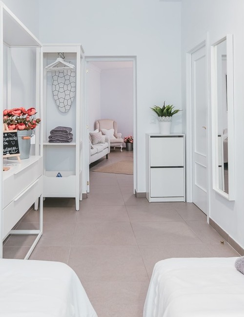 Amplia habitación de 50 m² ideal para familias o grupos, situada al fondo del pasillo, lo que garantiza máxima tranquilidad y privacidad. Dispone de dos habitaciones independientes: una con dos camas individuales de 90x200 cm que da al patio chill-out interior, y otra con cama doble de 160x200 cm y un sofá, exterior y con acceso visual a un patio con techo abierto.