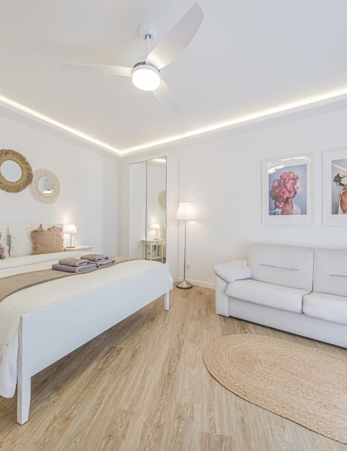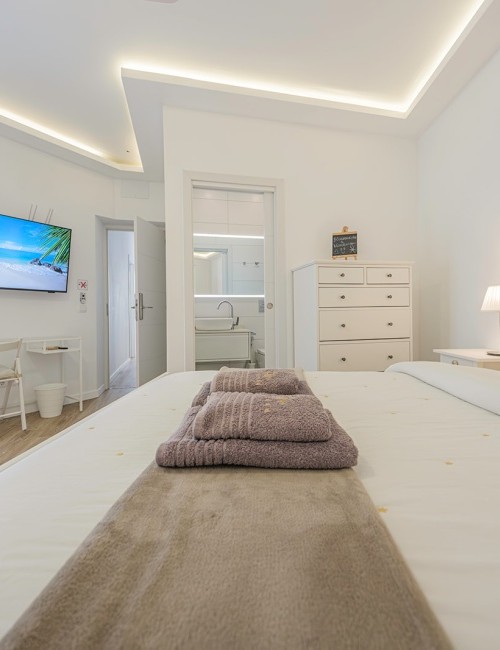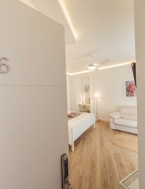 Habitación exterior de 21 m², situada en la entrada de la planta 2. Cuenta con cama king size de 180 x 200 cm y vistas al patio abierto sin techo. Equipada con mosquiteras, estor opaco, cortinas y visillos. Dispone de Smart TV de 55”, armario con espejo y percheros, ventilador con mando a distancia y luces LED con cambio de color, suelo de imitación parquet y cerradura electrónica inteligente.
